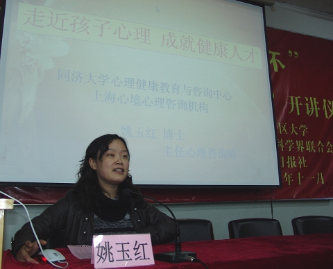来自同济大学的心理学博士姚玉红老师一开课就与在座的家长一起互动,几句精妙的词语解释,引来阵阵欢笑声。“父母大讲堂”大型公益讲座活动就在如此轻松的气氛下开课了,这次活动是由湖州社区大学、市社科联、湖州日报社联合举办的,旨在通过社区教育的平台,以现代心理学教育为主要内容,提高家长素质、促进未成年人健康成长。