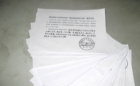 为了让大家更好地了解“两会”,深入其境地感受两会,国际贸易与外国语分院团委举办了“假如我是两会代表”的模拟两会活动。发放“假如我是两会代表”提案调查问卷100份,让分院学生站在两会代表的立场上,从自身肩负的担子出发,提出自己认为最有价值的提案。而提案的内容可以是国家的大政方针,也可以针对自己的学校提出一些具体建议。通过本次活动,让分院同学意识到每个两会代表都肩负选民的重托,承载选民的希冀,行使选民授予的权力,就应尽职尽责地为选民服务,勇作选民利益的忠实代言人。