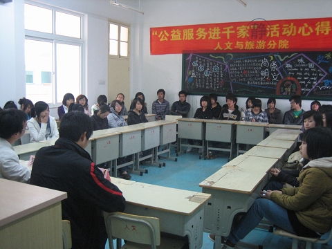 4月1日下午,人文与旅游分院每月一次的“公益服务进千家”活动座谈会在2309如期召开,分院辅导员老师以及各班公益服务联络员、服务典型户代表等参加了交流讨论。这是自2008年1月第一次座谈会召开以来,分院以座谈会的形式举行的第11次交流活动。