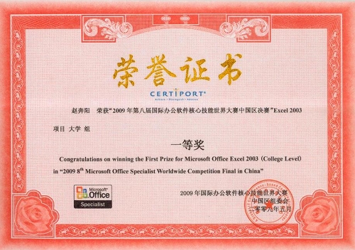 5月17日从上海传来喜讯,我校机电工程分院计应0801班学生赵奔阳同学在“2009年第八届国际办公软件核心技能世界大赛中国区决赛”Excel2003项目大学组比赛中获一等奖。