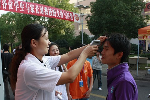 今年,甲型H1N1流感突袭中国大陆,尽管我校至今未发现一个病例,但为了确保新生的安全和校园的稳定,每位新生只有通过校门口的体温测试,确认正常后方能办理入学手续。此外,学校还为每个新生寝室配备了体温计,新生入住后,将与老生一样实行晨检制度和每日登记制度。