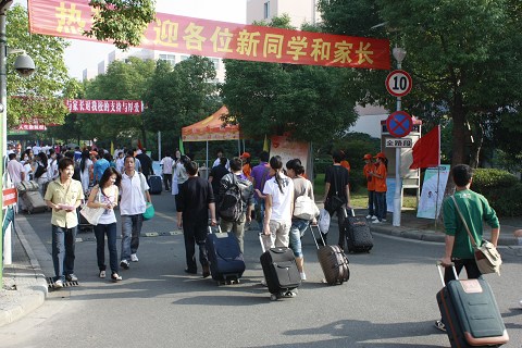 9月19日,圆顶广场中人声鼎沸,2009级新生和家长们在志愿者的引领下,有序地前往各自的班级报到注册。