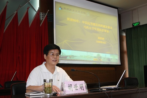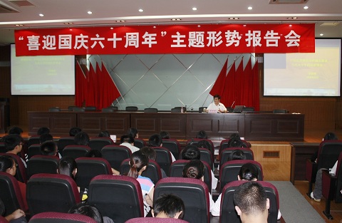 9月28日下午,校思想政治理论教学研究部举办了“喜迎国庆60周年,唱响校园主旋律”主题形势报告会。校长胡世明教授主讲,师生代表近400余人参加此次会议。