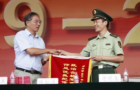 陈松源向军训优秀教官颁发了荣誉证书,并代表学校向部队赠送了锦旗。