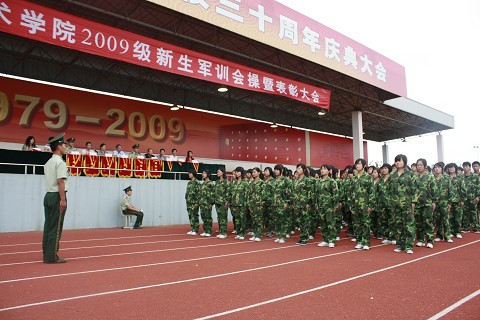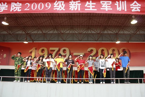 9月29日下午,我校在操场隆重举行了2009年新生军训会操暨表彰大会。在分院评比中胜出的20个班级现场进行了队列训练表演,展示了军训的成果。校领导陈松源、吴海燕和部队领导以及相关处室、分院的负责人出席了大会。