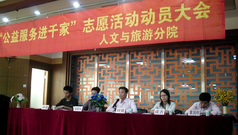 10月23日下午,人文与旅游分院召开了2009学年“公益服务进千家”动员大会暨2008学年公益服务先进个人表彰大会。分院党总书记杨群欢、校团委副书记刘竞、相关部门人员共180余人参加了会议。