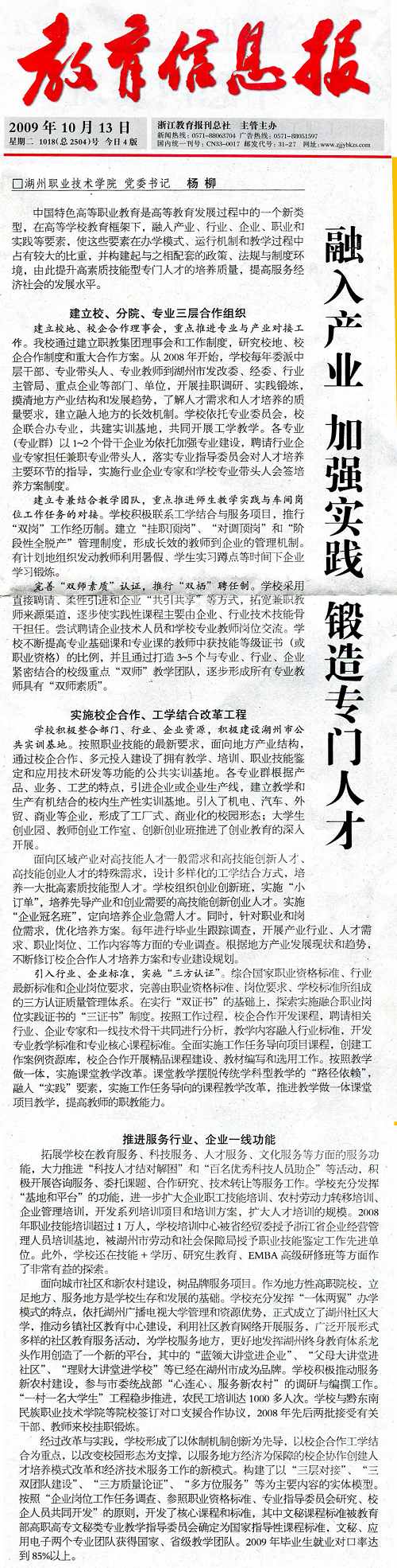 世界经融危机给当前大学生就业平添了许多压力,但同时,在一定条件下压力也可以转化为动力。我省高校各施妙招,苦练内功,千方百计提高学生的综合素质,增强他们的就业核心竞争力。10月13日出版的《教育信息报》“高教经纬”栏目专门组织了主题为“努力提高每一位学生的就业竞争力”的专版,以较大篇幅刊发表了党委书记杨柳教授题为《融入产业 加强实践 锻造专门人才》的文章。
