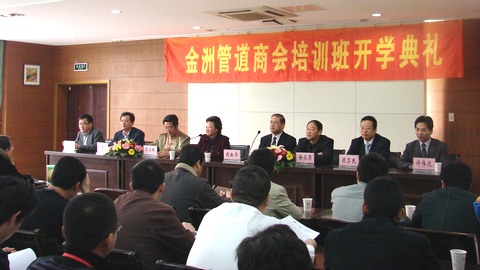 即将上市的金洲管道科技股份有限公司组织的金洲管道商会经销商培训班于3月20日上午在我校举行开班典礼。金洲集团有限公司总裁周新华、总经理沈淦荣、沈永泉、金洲管道商会秘书长郭江林等金洲集团的领导和金洲管道商会的经销商等共计80余人出席了开班典礼。副校长沈琪芳出席开班典礼并致辞。