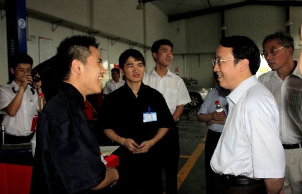 座谈会前,刘希平厅长一行实地考察了我校中央财政支持的国家级职业教育实训基地——电子电工及自动化实训中心、建筑技术实训中心以及湖州大唐汽车服务有限公司投资3500万建设的“大唐一站式汽车服务中心”,走访了大学生创业园,并与学生亲切交谈,了解学生学习生活和创业公司经营情况。