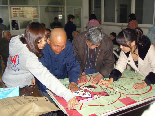 活动中,老人将写了自己愿望的卡片拼贴在一张大型海报上,形成了一个完整的心形图案,体现此次感恩节的活动主题。活动在志愿者们的一首歌曲“感恩的心”中落下了帷幕,在志愿者们即将离去之际,老人们拉住了志愿者,将一幅由他们自己制作的“感恩报”送到了志愿者的手中。