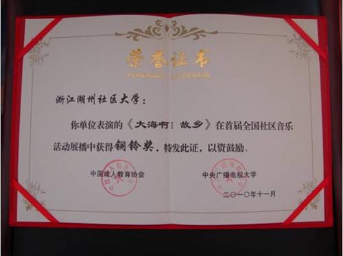 从浙江省社区教育指导中心传来喜讯,由社区大学办公室和艺体中心联合选送的《大海啊!故乡》获得由中国成人教育协会和中央广播电视大学联合举办的首届全国社区音乐活动展播铜铃奖。