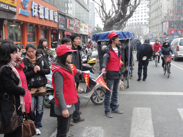 红色的志愿者马甲与帽子,标识有“文明劝导员”的臂章,挥舞的红色小旗子,忙碌的身影和一直保持在脸上的温和微笑,自3月5日起,湖州市中心交通拥堵最严重的四个路段出现了这么一批关注着行人的交通问题,义务维持交通秩序并向行人发放交通安全宣传材料。他们就是来自湖州职业技术学院国际贸易与外国语分院的交通文明劝导志愿者。