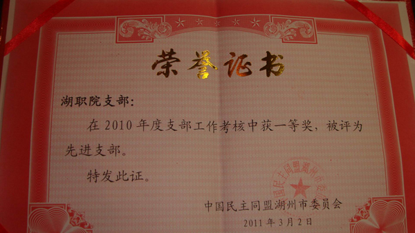 2010年民盟湖职院支部在学校统战部和民盟湖州市委的领导下,围绕市委市政府的中心工作,立足学校工作重心,发挥专业优势,继2009年度全市的考核中排名第一后,又获2010年民盟湖州市委对全市各支部的年度考核中排名第一,并获得一等奖。