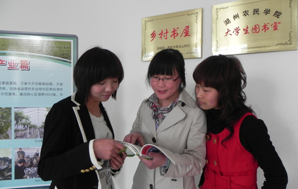 “湖州农民学院大学生图书室”、“湖职院、湖电大乡村书屋”是由农民学院办公室和图书馆共同推动实施的,能提供给农民实用的书报刊和音像制品,具备阅读视听条件的公共文化服务设施。目前已在菱湖、埭溪、八里店等乡镇或教学点建成三所。按照建设标准,每个图书室可供借阅实用图书达1000余册,覆盖种养殖、农产品加工、文化教育、法律、医疗卫生等多个领域。图书室配备专职管理人员,并建立图书分类、借阅和日常维护等一整套规范的管理制度。