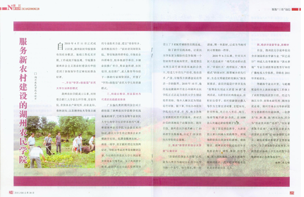 由浙江省农业和农村工作办公室、浙江省新农村建设促进会联合主办的《浙江新农村》杂志于2011年4月第28期以“服务新农村建设的湖州农民学院”为名,报道了湖州农民学院办学成果与办学经验,其中,对开创“学历+技能型”农民大学生培养模式;构建以教学、创业基地为代表的实践教育体系;推进“新型农民创业大讲堂”公益培训;稳步开发新专业、新教材的全新办学模式进行了详细介绍,这是省级机关杂志首次报道湖州农民学院。