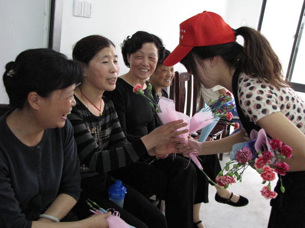 在活动中,西白鱼潭社区的阿姨们作为社区代表,表演了腰鼓、朝鲜民族舞、扇子舞,欢乐的笑容,优美的舞姿,用舞蹈这种艺术语言欢庆自己的节日,体现了各位母亲们对生活的热爱。志愿者们纷纷为各位母亲们的精彩表演拍手叫好,为母亲们的美丽风采所感动。志愿者们也用自己的歌声和舞蹈,赞美伟大的母爱,歌颂伟大的母亲,活动现场的气氛再次活跃。志愿者们还将自己购买的康乃馨鲜花献给社区的各位母亲们,康乃馨的花语是:感谢母亲,志愿者们借助这一花语表达对各位养育子女付出无数心血的母亲们崇高的谢意。献花活动使整个活动掀起高潮,接到鲜花的母亲们拥抱每一个志愿者对他们的孝心表示赞扬和肯定。