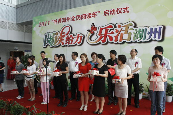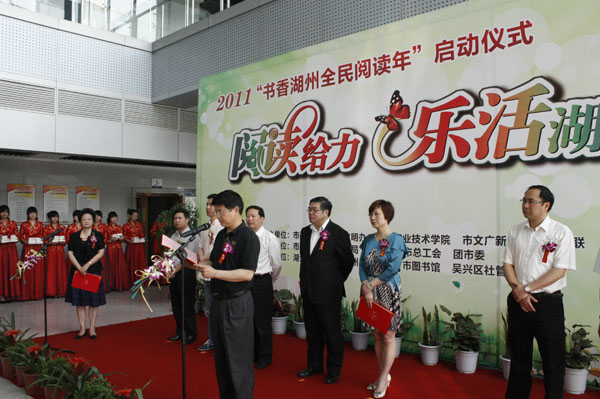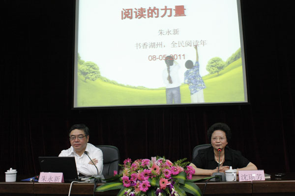 5月8日,由湖州市委宣传部、湖州市文明办、湖州市文广新局和我校联合主办,湖州社区大学具体承办的2011“书香湖州全民阅读年”启动仪式在湖州市图书馆举行。全国人大常委、民进中央副主席、中国教育学会副会长朱永新;市委常委、市委宣传部部长胡菁菁;市人民政府副市长沈建平;市人民政府副秘书长徐晏平;市文广新局党委书记、局长宋捷;市委宣传部副部长、市文明办主任沈铭权;市社科联副主席徐育雄;校长胡世明;副校长沈琪芳等领导出席本次活动。来自全市市直机关、街道社区、企业、学校的300余名干部群众参加了本次活动。沈琪芳主持启动仪式。