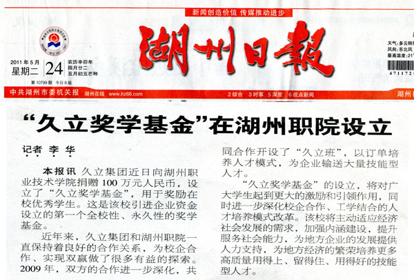 【湖州日报】“久立奖学基金”在湖职院设立