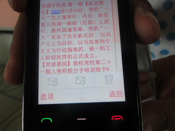 人文分院学生第一支部党建手机报目前开设“政治理论”、“党建要闻”、“活动传真”等栏目,内容丰富、文字简练,每周发送一期。随着该项工作的不断深入,党支部还将继续丰富手机报的内容,完善对学生成长成才有用的各类信息。