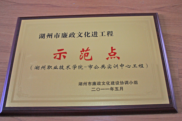 根据中央、省、市纪委有关廉政文化创建的工作要求,2010年我校结合自身特点,认真开展廉政文化进工程活动,将湖州市公共实训中心项目作为“廉政文化进工程”示范点申报,经过近一年的努力,日前被授予“湖州市廉政文化进工程示范点”荣誉称号。
