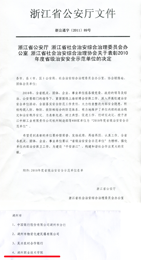 日前,浙江省公安厅、浙江省社会治安综合治理委员会办公室、浙江省社会治安综合治理协会公布《关于表彰2010年度省级治安安全示范单位的决定》,我校被授予“2010年度浙江省治安安全示范单位”荣誉称号。