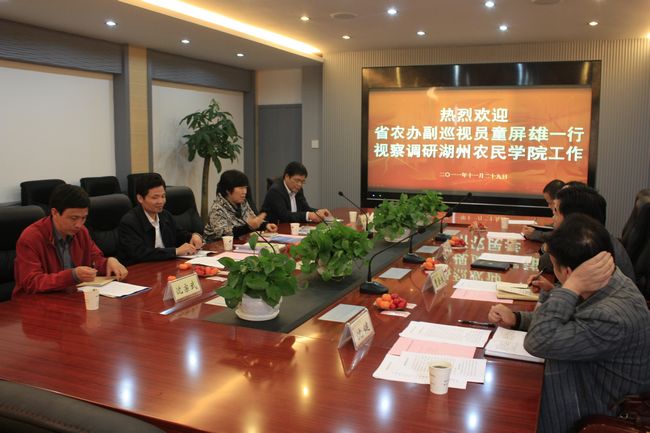 11月29日,省农办副巡视员童屏雄、机关党委书记王丰明一行在湖州市农办副主任、湖州农民学院副院长姚红健、市农办农改处处长沈宗武的陪同下来我校调研。党委书记、湖州农民学院管委会副主任杨柳,副校长、湖州农民学院院长沈琪芳及相关部门负责人参加了座谈。