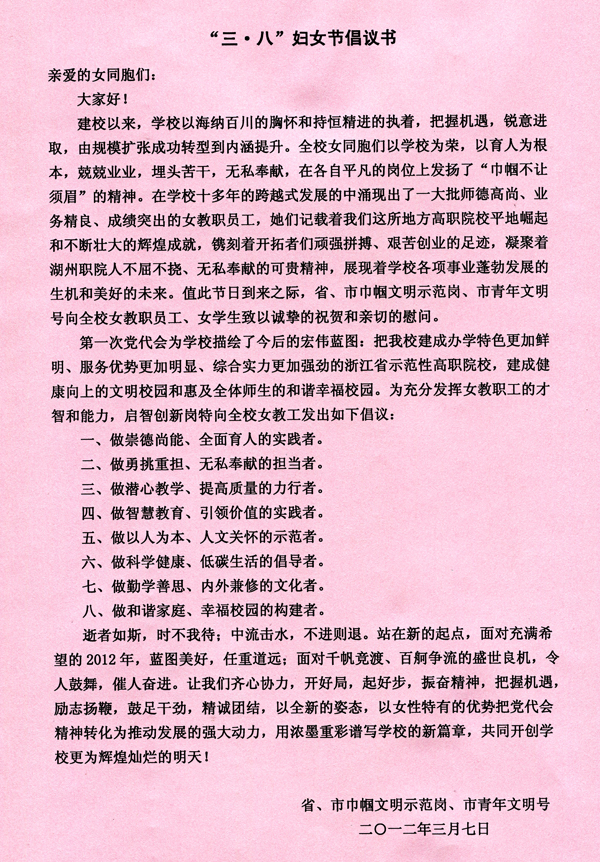 座谈会上,省、市巾帼文明示范岗,市级青年文明号还向全体女性教职员工发出倡议,号召大家做崇德尚能、全面育人的实践者;勇挑重担、无私奉献的担当者;潜心教学、提高质量的力行者;智慧教育、引领价值的实践者;以人为本、人文关怀的示范者;科学健康、低碳生活的倡导者;勤学善思、内外兼修的文化者;和谐家庭、幸福校园的构建者。
