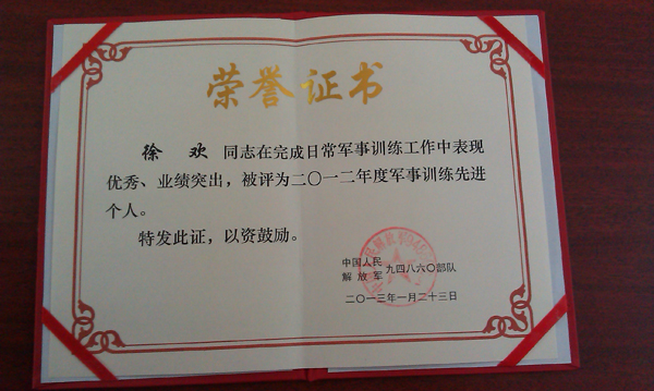 近期,学校人武部从部队收到入伍学生徐欢发来的喜报。徐欢原为工商管理分院投资1002班学生,2011年底入伍,目前在南京军区空军服役。入伍以后,徐欢在部队认真训练,各方面表现积极,对于工作和任务认真负责,受到部队领导的一致好评,其在部队的自身感受也非常深刻,曾多次写信和打电话回学校向班主任等汇报在部队的情况和感受,表示要在部队的大熔炉里更加积极地锤炼自我。通过一年多的努力,徐欢获得2012年度“优秀士兵”、2012年度“军事训练先进个人”荣誉称号并发回喜报。