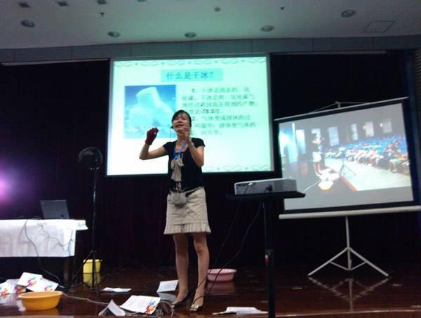 担任本次科普活动的老师们特意为此次活动挑选了几个精彩的趣味实验。一个普通的灯泡能把钉子钉进木板,小小的两个一次性纸杯能承受一个人的重量,这些看似不可能完成的任务,竟然在众目睽睽之下表现的如此淋漓尽致,而神奇的麦比乌斯带更让现场的孩子们觉得不可思议。当活动进入苹果老师边讲解边演示的化学“干冰秀”实验环节时,孩子们零距离亲眼目睹了干冰的奇特化学景象,还亲身体验了由干冰混合沐浴露所产生的泡泡来“洗澡”。当整个舞台地面被干冰迅速挥发所产生的大量汽雾环绕时,现场不时发出啧啧的惊叹声。伴随着西游记那熟悉的旋律,四个扮演唐僧师徒取经的孩子犹如游走于仙镜中一般美妙,至此活动达到了高潮。台下的孩子们也纷纷上台体验犹如腾云驾雾般的神奇感觉,“真漂亮,这么有趣的实验我还第一次看到”,一些孩子兴奋地围着老师说。(远程教育学院/公风华)