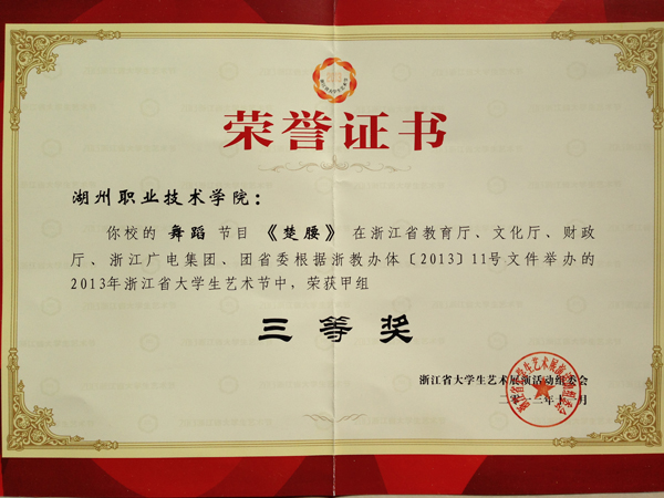 日前,由浙江省教育厅、文化厅、财政厅、 团省委举办的“民族魂•中国梦”2013年浙江省大学生艺术节在杭州圆满落幕。本次艺术节共有66所高校选送了舞蹈、戏剧、艺术社团展示及校园十佳歌手等类别的380个节目,经组委会办公室审核和专家组评选,我校艺术团舞蹈《楚腰》荣获甲组三等奖。(艺体中心/张敏)