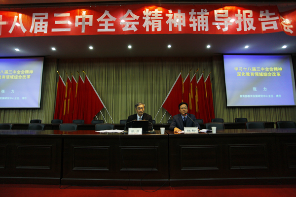 为了深入学习贯彻十八届三中全会精神,12月14日,十八届三中全会《中共中央关于全面深化改革若干重大问题的决定》起草人之一、国家教育发展研究中心主任、博士生导师张力研究员,应邀来校作十八届三中全会辅导报告。参加2013年地市高职教育论坛暨研究中心联席会议的全体代表、学校全体党员干部、师生聆听了报告。报告由党委书记杨柳主持。