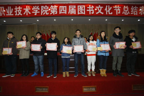 会议表彰了“2013年读书先进班级”、“2013年读书标兵”、“我与图书馆”征文、“新环境,新视野——大学新生看校园”摄影活动及优秀志愿者的获奖集体和个人。动漫1301班求一文同学、文秘1202班何江琴同学与顾佳云同学,人力1301班田蜜同学、酒店1201班奚婵娟同学作为获奖代表上台发言。
