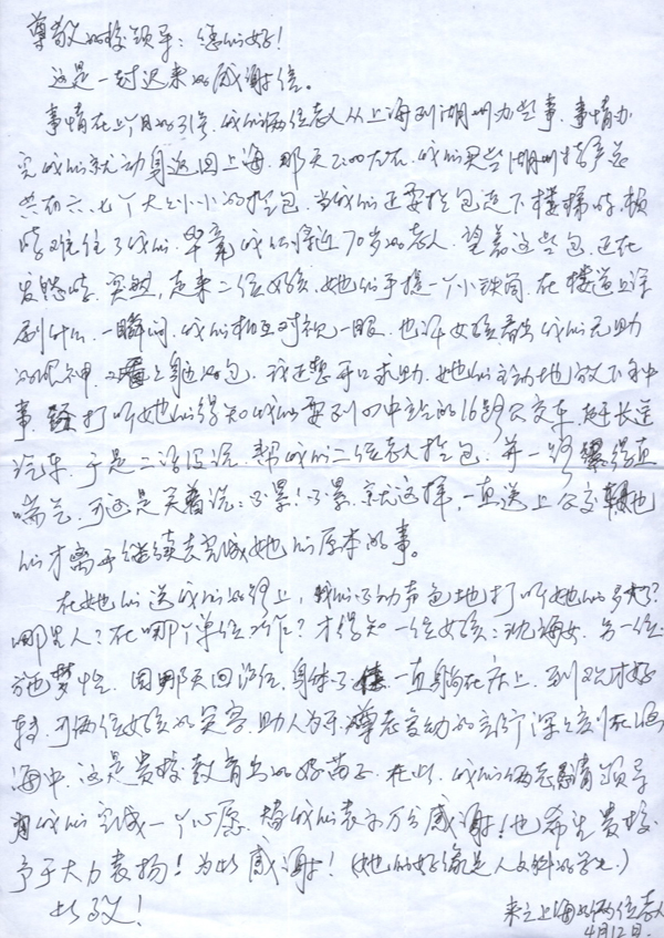 日前,人文旅游分院收到一封来自上海的表扬信,信中表扬了旅游1302班沈海女、施梦怡两位同学助人为乐的“善举”。