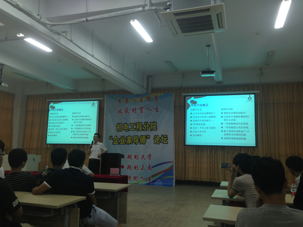 在论坛正式开讲之前,首先举行了“企业家导师论坛”开讲仪式,主持人向大家介绍了项目实施的背景、意义和基本实施模式,并为首期开讲的浙江康达汽车湖州分公司总经理孟金锋颁发了兼职导师证书。随后,浙江康达汽车湖州分公司总经理孟金锋作了题为《汽车行业发展现状与职业成长》讲座。整个讲座过程中,孟先生结合自身奋斗历程,以轻松诙谐的语言分别从汽车行业概况、汽车行业岗位相关,进而到职业生涯规划等方面跟学生作了深入的讲解。他以独到的眼光分析了当前汽车行业的形势和前景,对行业岗位的角色分工作了详细的介绍,并以自身经历现身说法讲述汽车行业人员应如何在技术与管理中明确自己的发展方向。在不断地互动和专业共鸣中,同学们听得相当入神,参与热情高涨。活动后,学生普遍反映,本次专业讲座效果显著,在职业方向上为广大汽车专业学生拨开云雾,让学生更加明确了自身定位和职业生涯发展方向,并希望分院以此为平台多开类似讲座。