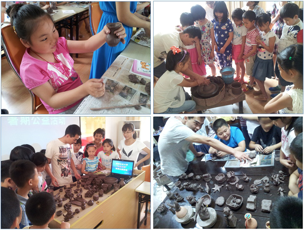 在都市家园、碧浪湖等社区,来自我校陶艺坊的专业老师与大学生志愿者们把陶艺课堂直接搬进了社区,孩子们在家门口就能学习体验陶艺的乐趣。陶艺课程内容丰富,包括陶艺制作示范、转台体验、DIY制作、作品评奖等。在制作示范环节,孩子们争先恐后地围观在老师周围,一脸兴奋溢于言表,不时传出惊喜与赞叹的声音。到了体验环节,孩子们紧紧依偎排着长队,迫切等待着一试身手。在专业老师的指导下,随着陶艺工作台的快速旋转,一双双沾满泥巴的小手尽情享受着泥巴如变形金刚似的神奇,虽然手脏了也毫不在乎。在DIY制作环节,孩子们根据自己的兴趣,充分发挥想象力,捏出了形态各异、个性张扬的陶艺作品。最后,老师评选出了十大优秀作品,并给予了奖励。