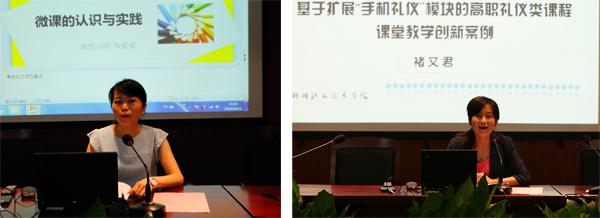 人文旅游分院的褚又君老师受邀作了主题为“基于扩展‘手机礼仪’模块的高职礼仪类课程课堂教学改革创新”的分享。褚老师从三个内容进行展示:一是手机礼仪教学模块的提出原因;二是手机礼仪教学模块的基本设计构架;三是课程改革的实施效果。在智能手机普及的今天,学生课堂上手机的不规范使用,造成了上课“低头族”,从而影响了学生的学习效率和教师的上课效果。褚老师用案列分析的形式,运用图片等多种资料的形式展示了“手机礼仪”的相关内容。