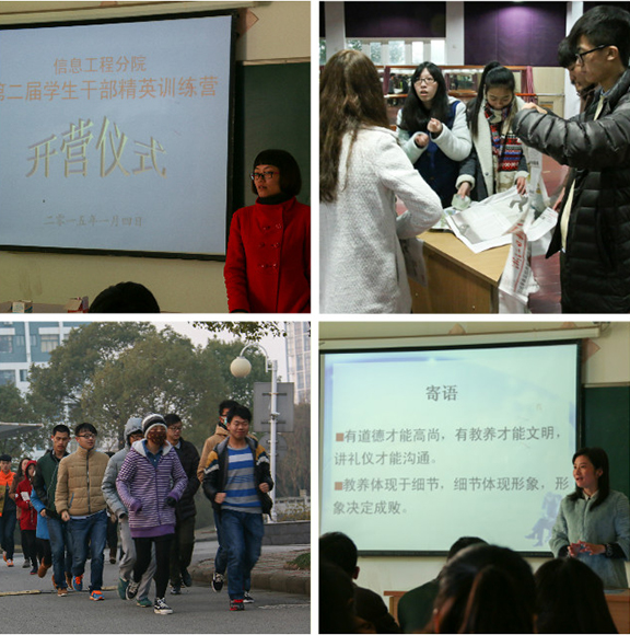 为切实加强学生干部尤其是学生骨干队伍培养,信息工程分院积极探索构建“课程化”培训体系,分院专门成立以分院党总支书记牵头,学工办主任负责的信息工程分院学生干部精英训练营,2015年1月以来,分院开展了第二届学生干部精英训练营。