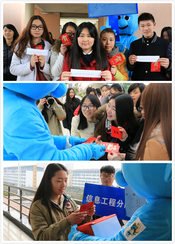 3月9日是开学第一天,很多学生还未真正进入到开学的状态,信息工程分院的现实版“抢红包”,着实让不少学生迫不及待的进入课堂。本次抢红包活动分为两个部分:活动一:信息工程分院吉祥物蓝蓝为开学第一天来上课的小伙伴们准备了100个红包。它们或许就在班级教室、上课教室、实训室和工作室里,如果想抢到红包,3月9日一早,可不能赖床了;活动二:3月9日上午9点30分开始,信息工程分院吉祥物蓝蓝将出现在分院教学楼区域(10、11和12号楼),只要发现蓝蓝,并且能够答对本次活动“红包通关口令”,就可获得红包一个。