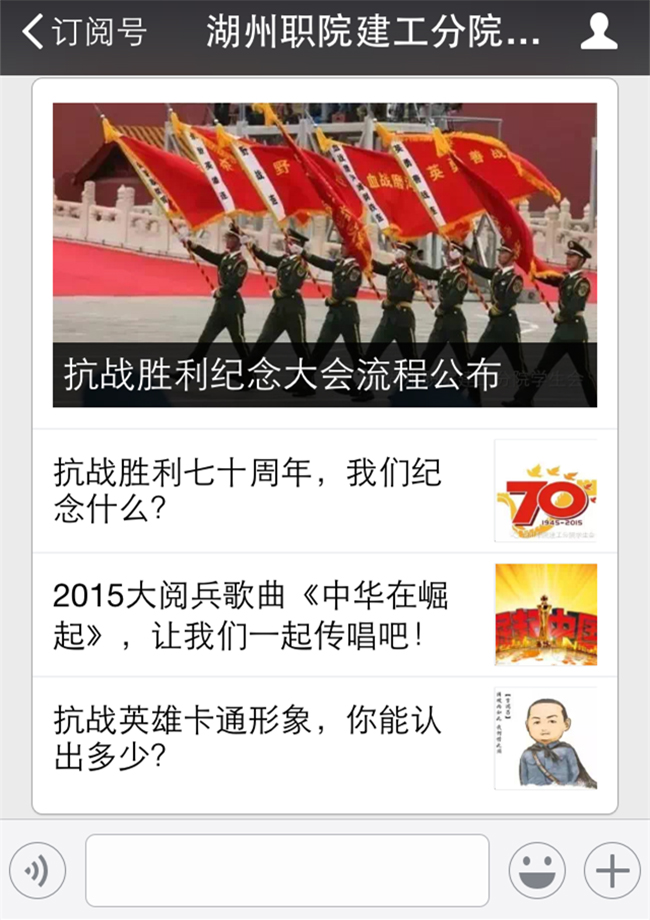 建筑工程学院的学生干部通过微信公众号、QQ群等途径向同学推送抗战胜利纪念大会流程安排、阅兵仪式亮点、抗战胜利伟大意义等时事热点,号召大家通过多渠道及时关注、收看相关纪念活动的盛况,机电与汽车工程学院、物流与信息工程学院、商贸与经济管理学院的学生干部也依靠微信、微博的影响力让同学们感受到此次阅兵式的热烈气氛和重要意义,旅游与公共管理学院学生干部向学院全体同学发出倡议:“让我们用勤奋学习、全面提高、勇担重任的实际行动告慰我们的前辈和英烈!”艺术设计学院学生干部开展了微博互动、走访家乡老党员、观看阅兵仪式等纪念活动。阅兵式结束后,学生干部们纷纷通过微博、微信开展热烈的交流,缅怀为国捐躯的抗战英烈,深切感受到国家的强盛,表达了作为一名中华儿女的强烈自豪感和责任感。