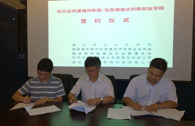 深圳市怡亚通供应链股份有限公司成立于1997年,总部设在深圳,是中国第一家上市供应链企业,旗下现有90余家分支机构,全球员工3000余人,正在搭建未来3-5年将遍布全国380个城市的深度分销与分销执行平台,并积极扩展海外布局,形成覆盖全国、辐射全球的供应链服务网络。洽谈会上,深圳市怡亚通益达教育服务有限公司总经理戴敏华向胡世明校长一行介绍了企业与深圳职业技术学院、漳州职业技术学院和陕西职业技术学院等校企合作的具体情况,并就与我校联合打造创新创业企业孵化基地达成了初步意向。胡世明校长、戴敏华总经理及国资委中国商业企业管理协会副会长郑天舒还分别代表校行企三方签订了《湖州职业技术学院 怡亚通创新创业学院框架协议(备忘录)》。