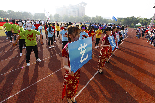 上午8时许,伴随着激昂高亢的运动员进行曲,国旗队、校旗队、会旗队、彩旗队首先入场,各学院方阵相继入场,主席台领导及全场师生挥手鼓掌致意。为展现特色,方阵展示匠心独运,各具特色,五颜六色的队服,气势磅礴的口号,优雅舒展的舞蹈,憨态可掬的吉祥物和富有特色的道具展示,精彩的表演将开幕式的气氛推向高潮。