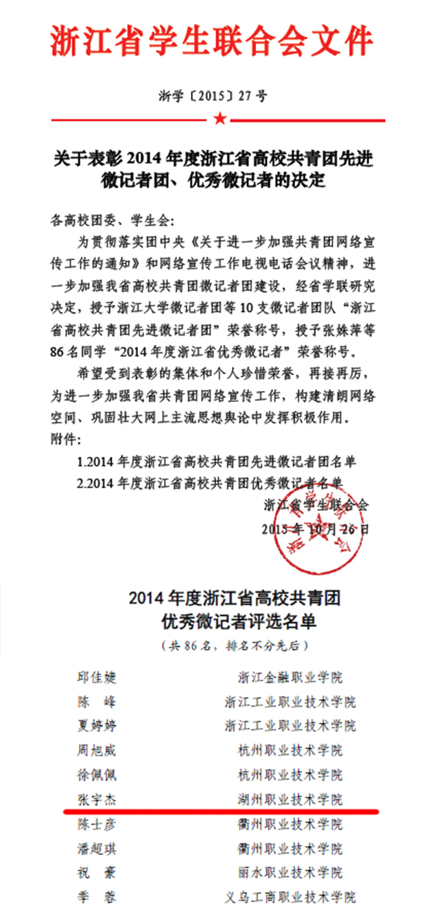 日前,浙江省学生联合会下发了《关于表彰2014年度浙江省高校共青团先进微记者团、优秀微记者的决定》(浙学〔2015〕27 号)文件,我校旅游与公共管理学院酒店1302班张宇杰同学被授予“2014年度浙江省高校共青团优秀微记者”荣誉称号。该项荣誉由浙江省学生联合会牵头评选,经高校团委选拔推荐、省学联统一差额评选、审定。