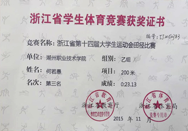浙江省第十四届大学生运动会于11月8日至13日在温州大学举行。我校田径队共组织9名运动员参加本次运动会。其中,商贸与经济管理学院电商1401班的何若愚同学获男子乙组200米一枚铜牌,机电与汽车工程学院汽检1401吴晓峰同学获男子乙组标枪第五名的好成绩。体育教研部田径国家级裁判徐迅老师担任本届赛事的田径裁判工作,荣获“浙江省第十四届大学生运动会田径比赛优秀裁判员”称号。
