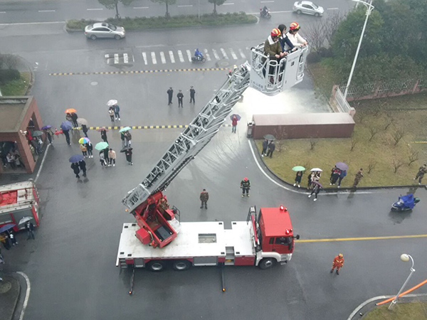15点30分,各部位人员准备就位,随着消防部队指导员宣布演习正式开始的指令,烟雾弹弥漫了现场,部分学生用毛巾捂住口鼻,沿着指定出口快速前进,有序撤离到安全地带,消防车也及时到达,进行水枪喷水灭火,还有一些学生在使用灭火器灭火,被困在三楼的学生在消防官兵的帮助下,利用九米拉梯逃离火场,在五楼的学生,消防官兵通过云梯车成功施救下来。
