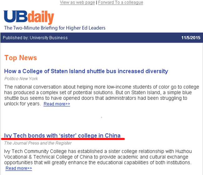 新闻链接::http://www.universitybusiness.com/news/ivy-tech-bonds-%E2%80%98sister%E2%80%99-college-china