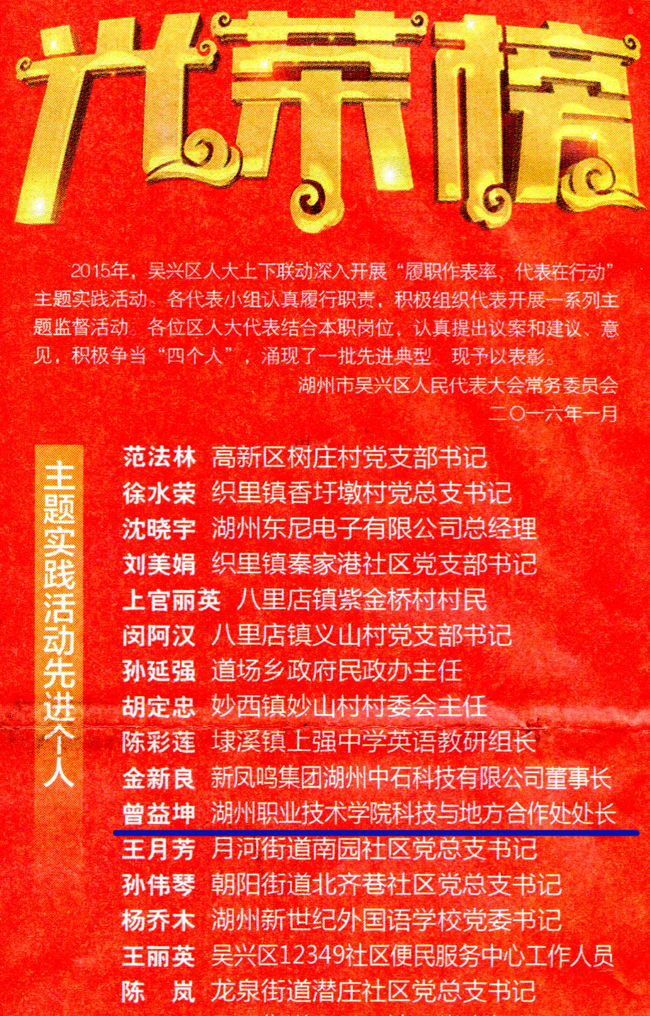 从1月12日举行的吴兴区三届人大五次会议预备会议上获悉,我校科技与地方合作处处长曾益坤代表被评为2015年度“履职作表率、代表在行动”主题实践活动先进个人,这也是他履职吴兴区人大代表以来第二次获得此项殊荣。