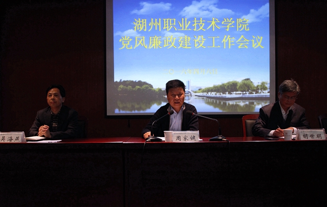 校党委书记周家健全文传达了省委教育工委书记、省教育厅厅长刘希平同志在全省教育系统党风廉政建议工作会议上的讲话,要求学校进一步抓好学习与落实。周家健就认真贯彻落实全国、全省教育系统党风廉政建设工作会议精神和上级党委、纪委要求,深入推进学校党风廉政建设工作,作了题为《全面从严治党 为建设区域性高职名校提供坚强组织纪律和政治保证》的重要讲话。