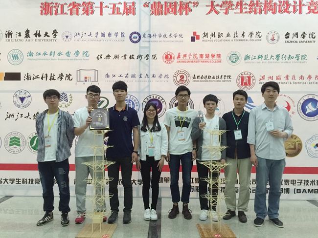 5月15日,浙江省第十五届大学生结构设计竞赛在浙江农林大学落下帷幕,来自浙江省近50所本、专科院校的102支参赛队参加了本次竞赛。本次大赛中,本专科参赛队同台竞技,分组评奖。经过3天的激烈竞赛,我校建筑工程学院由黄昆、黄奇老师指导,黄彦凯、王玲、周作文三位同学组成的“小太阳”代表队以专科组第一名的成绩再次获得 “特等奖”,由朱茂森、屠圣禹、何中涛三位同学组成的“小晴天”代表队获得“二等奖”。至此,我校学子在浙江省大学生结构设计竞赛中已连续三年保持领先。