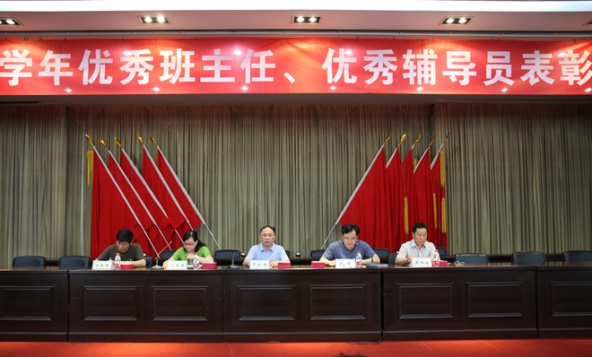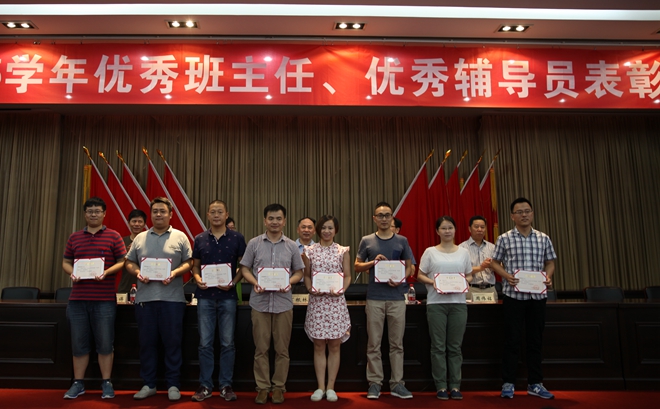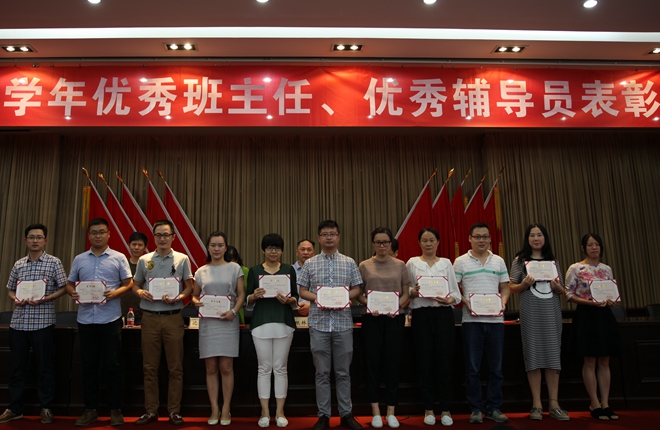 校党委委员、宣传部长兼党院办主任沈楚主持会议并希望全体班主任和辅导员要以更有激情的状态、更加扎实作风做好育人工作,真正把潜心育人作为自己的理想和事业,把学生成长成才作为自己最大的成就,为建设区域性高职名校做出应有贡献。校党委委员、组织部长沈建红宣读《关于公布2014学年、2015学年校“优秀班主任”、“优秀辅导员”名单的通知》。主席台就座领导为受表彰的优秀班主任、优秀辅导员颁发荣誉证书。