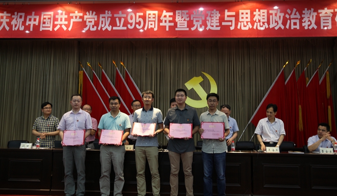 主席台就坐领导为受到学校党委通报表彰的张献锋等15位优秀共产党员、刘竞等6位优秀党务工作者以及商贸与经济管理学院党总支等5个先进基层党组织颁发了荣誉证书。周顾宇老师作为教工党员代表在大会上进行了交流发言。